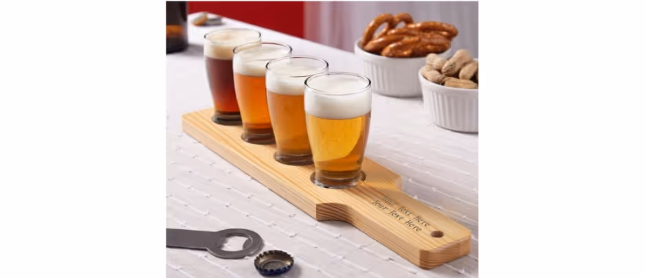 A beer flight is the perfect way to have an interesting afternoon or take a party to the next level! Provide the financial person in your life with a useful gift of an etched glass beer flight. It is customizable to add a thank you message on the paddle portion of the beer glass holder.
